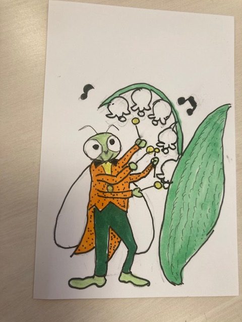 きりぎりすが、鈴蘭のはなで、音色を奏でている絵です。現実的ではないかな(笑)
