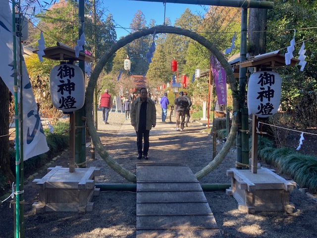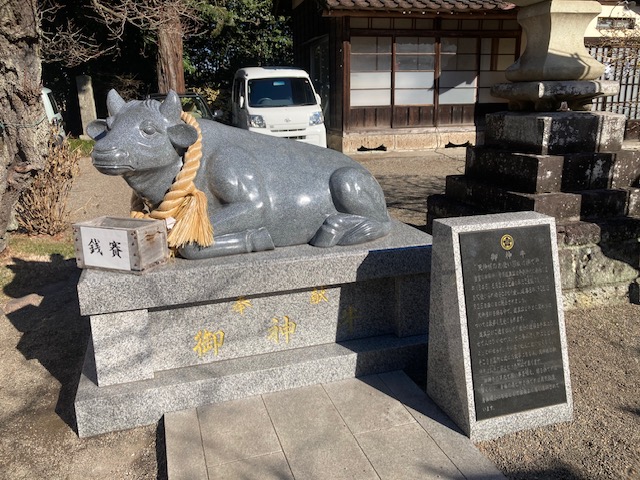 茅の輪くぐりと牛さんです。無病息災を祈りました。この牛さんは、自分の、調子の悪いところを、