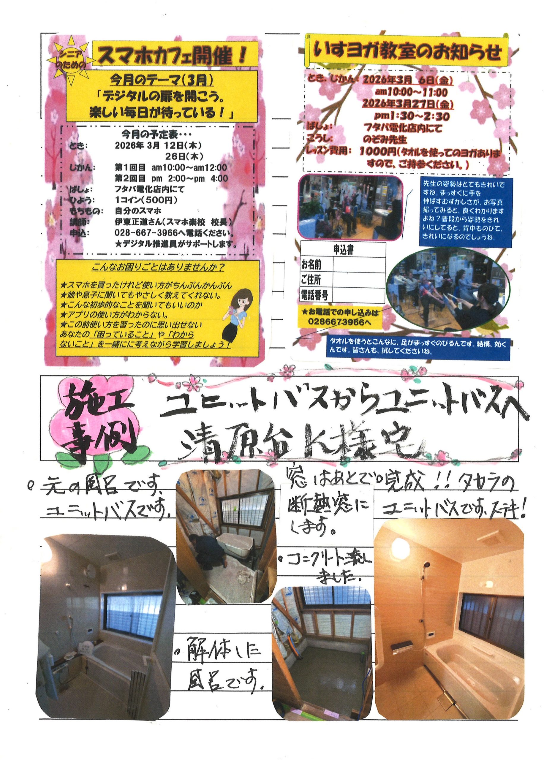 ☆2枚目は、スマホカフェ・いすヨガ教室・施工事例ユニットバスです。
