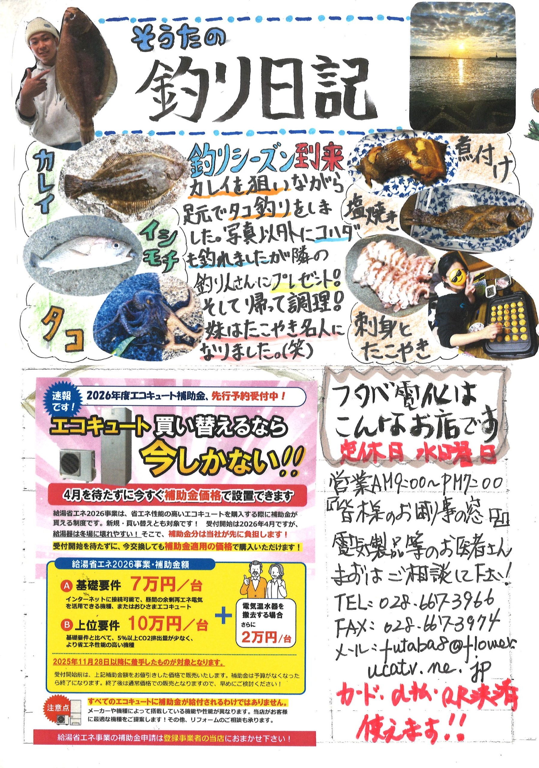 ☆4枚目は、そうたの釣り日記とエコキュートの交換工事です。