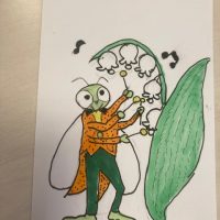 ★今月は、秋の虫です。 きれいな声でなくから、きりぎりすかな? きりぎりすが、鈴蘭のはなで、音色を奏でている絵です。現実的ではないかな(笑) ★私の腰の骨の快気祝いにと、お客様が、おはなをもってきてくださいました。きれい …